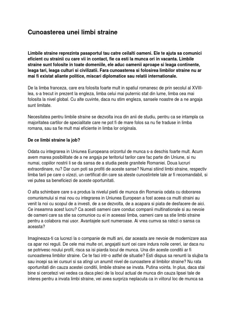329 din 2006 iar tu ai putea să te afli în situaţia de a le încălca acum. Conform cadrului european comun de referință pentru limbaje există 6 niveluri de limba engleză care se încadrează în 3 categorii diferite de cunoştinţe. Avem o echipă tânără care cuprinde profesori trainer traducători si interpreti formaţi în romania şi nu numai. Cerința de a scrie un text argumentativ despre necesitatea cunoașterii unor limbi străine în dezvoltarea personală au primit o elevii de la profilul uman care au susținut bacalaureatul la limba română în cadrul sesiunii august septembrie 2017.