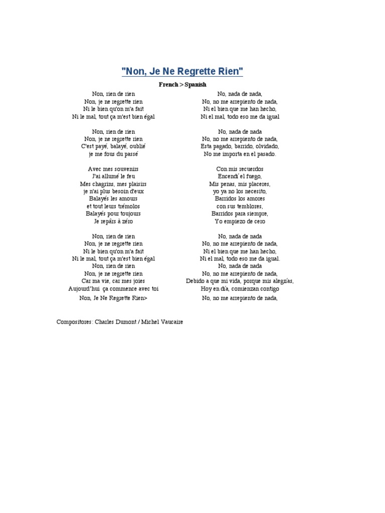 Non je ne regrette rien lyrics español. Non rien de rien no nothing of nothing non je ne regrette rien no i don t feel sorry about nothing ni le bien qu on m a fait not the good things people have done to me ni le mal tout ã a m est bien ã gal not the bad things it s all the same to me non rien de rien no nothing of nothing non je ne regrette rien no i don t feel sorry. Translation of non je ne regrette rien by édith piaf édith gassion from french to english deutsch english español français hungarian italiano nederlands polski português brasil română svenska türkçe ελληνικά български русский српски العربية فارسی 日本語 한국어. Non rien de rien non je ne regrette rien c est payé balayé oublié je m en fous du passé. English translation of lyrics for non je ne regrette rien by edith piaf.