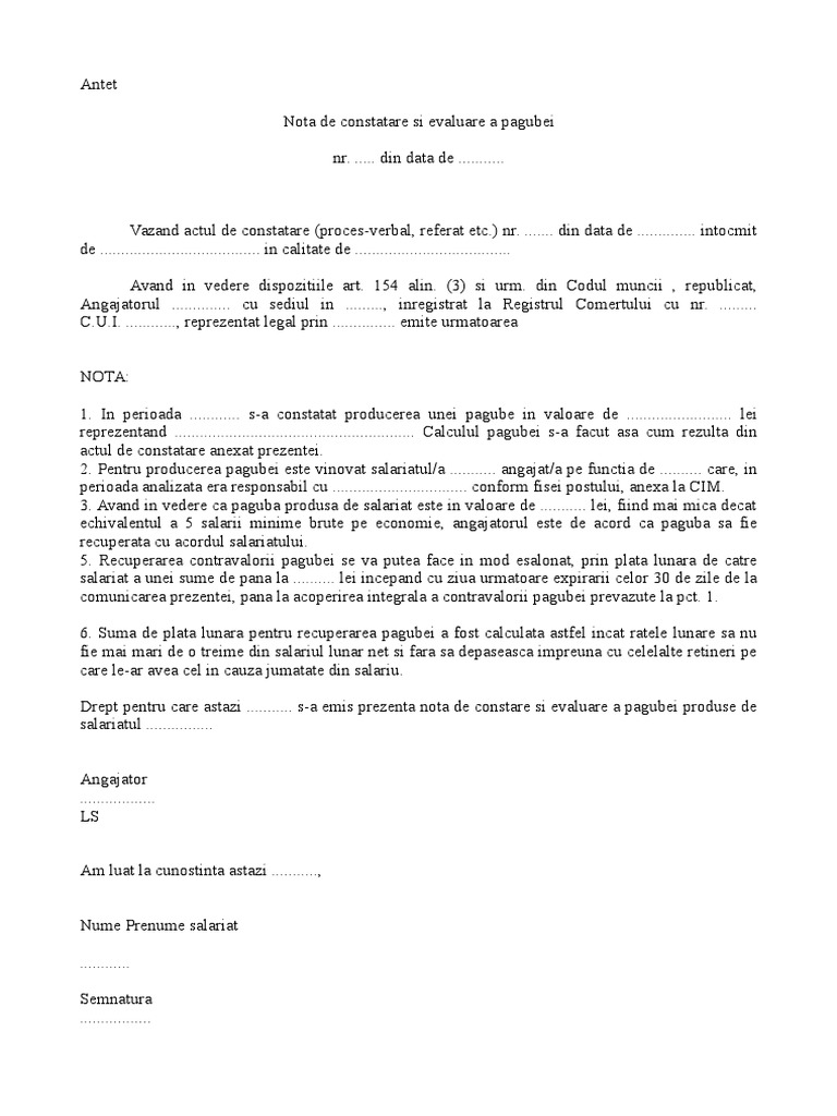 Nota de constatare si evaluare a pagubei. Consultatii juridice nota de constatare si evaluare a pagubei plangere impotriva procesului verbal de constatare a contraventiei. 3 din codul muncii republicat in situatia in care angajatorul constata ca salariatul sau a provocat o paguba din vina si in legatura cu munca sa va putea solicita salariatului printr o nota de constatare si evaluare a pagubei recuperarea contravalorii acesteia prin acordul partilor intr un termen care nu va putea fi mai mic de 30 de zile de la. Nota de constatare şi evaluare a pagubei angajatorul va putea solicita angajatului printr o notă de constatare şi evaluare a pagubei recuperarea contravalorii acesteia într un termen care nu va putea fi mai mic de 30 de zile de la data comunicării atunci cand constată că angajatul său a provocat o pagubă din vina şi în legătură cu munca sa. Manualul de politici gdpr.