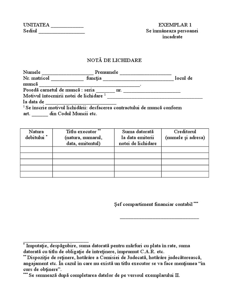 Nota de lichidare ar urma să devină un document obligatoriu de eliberat la încetarea tuturor contractelor individuale de muncă potrivit unui proiect de act normativ trecut luni de votul senatorilor. Nota de lichidare model. Nota de lichidare este un document opțional pe care angajatorii îl pot emite la încetarea contractelor individuale de muncă ale salariaților acesta fiind folosit în special pentru a consemna în scris existența sau inexistența datoriilor către firmă. Natura debitului creditorul numele si adresa suma datorata la data emiterii notei de lichidare titlul executor.