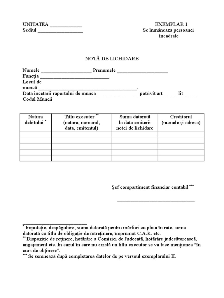 1 din legea contabilitatii fiecare societate are obligatia sa intocmeasca situatii financiare cu ocazia lichidarii acestora in conditiile acestei legi precum si in conformitate cu prevederile. Nota de lichidare nr. Nota de lichidare eliberată de angajator ca urmare a încetării contractului de muncă reprezintă o confirmare a faptului că. Nota de lichidare exemplarul 1 se inmaneaza salariatului.