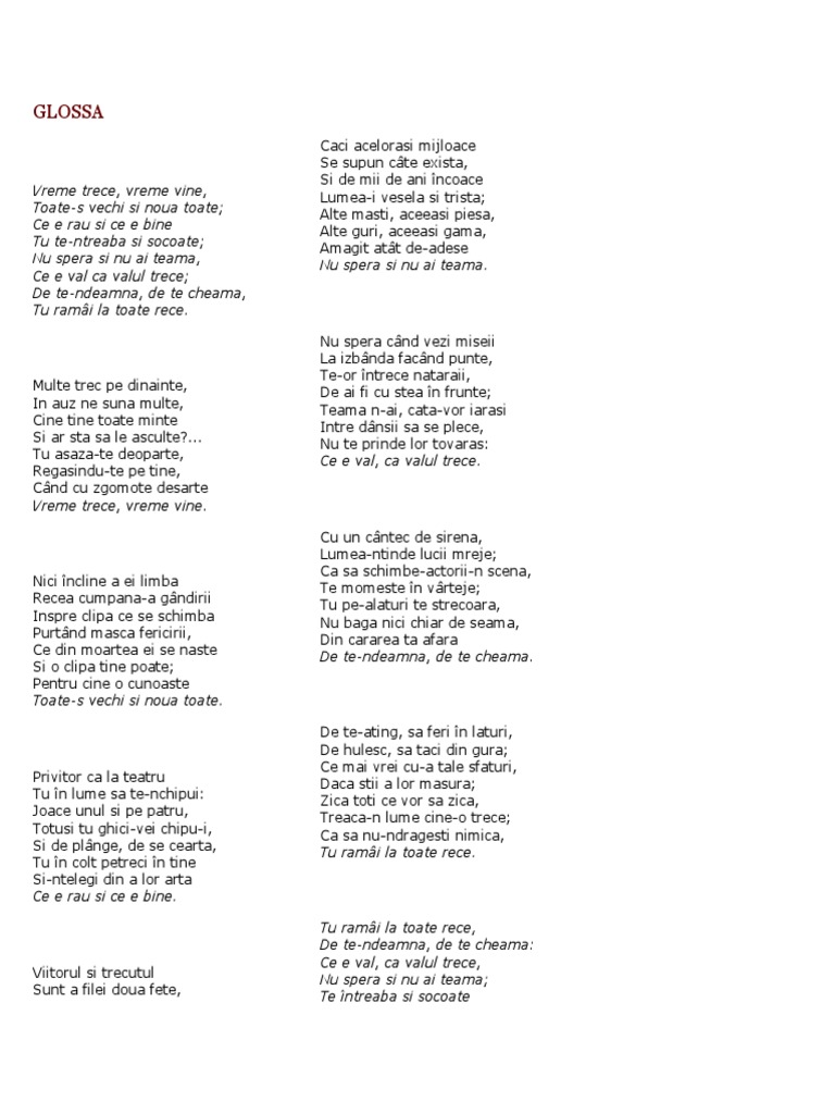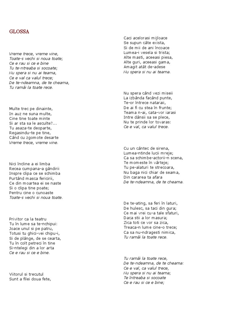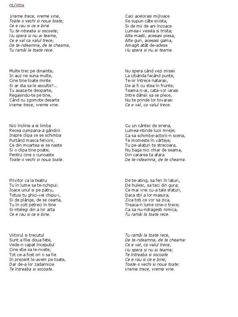Tu ramai la toate rece de te ndeamna de te cheama. Nu spera si nu ai teama. Vreme trece vreme vine. Te intreaba si socoate ce e rau si ce e bine.