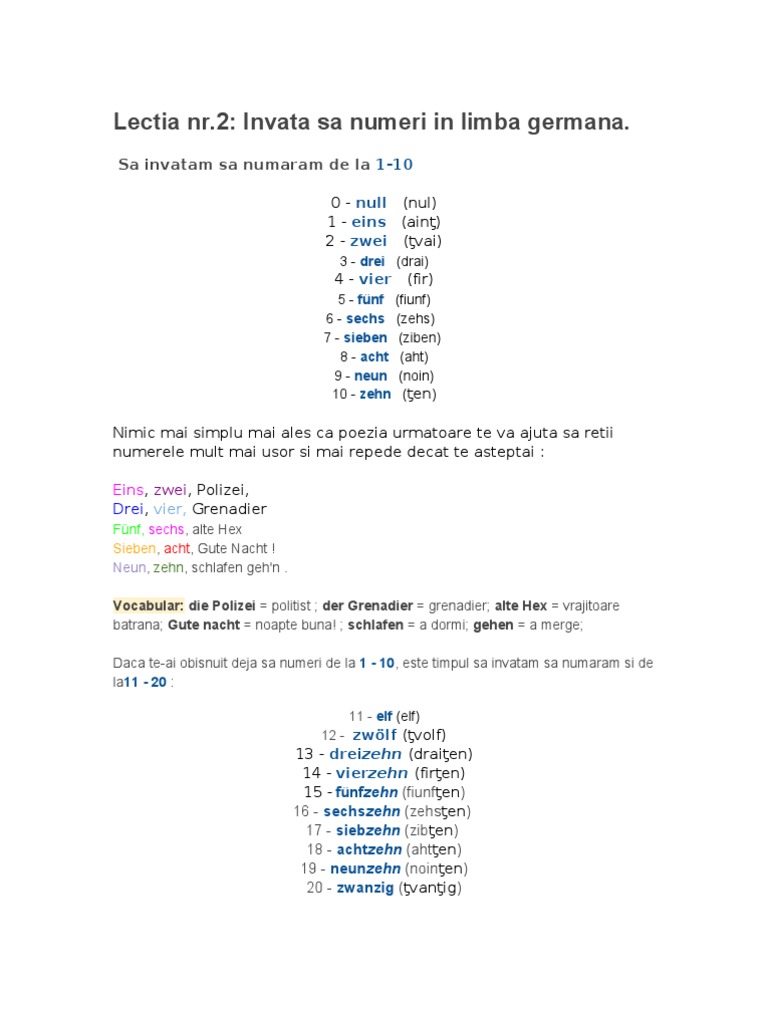 Nu difera cu nnimic de alte limbi poate doar pozitionarea dar daca invatati repede sa numarati de la unu la zece apoi din 10 in 10 pana la 100 restul este floare la ureche. Omul are două picioare der mensch hat zwei arme. Trimisă pe 1 august. Numeralul ordinal in limba germana poate avea mai multe terminatii deoarece este tratat asemanator unui adjectiv.