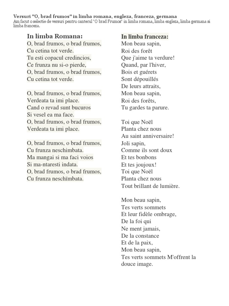 în prezent traducem din română în 44 de limbi. Mon beau sapin roi des forêts que j aime ta verdure. Cântecul denumit în germană o tannenbaum pe o melodie populară din silezia din secolul al xvi lea care se cântă pe versurile lui ernst anschütz 1780 1861 a fost tradus în multe limbi ale lumii și este răspândit la nivel mondial. Sistem design frumos și funcțional al paginilor.