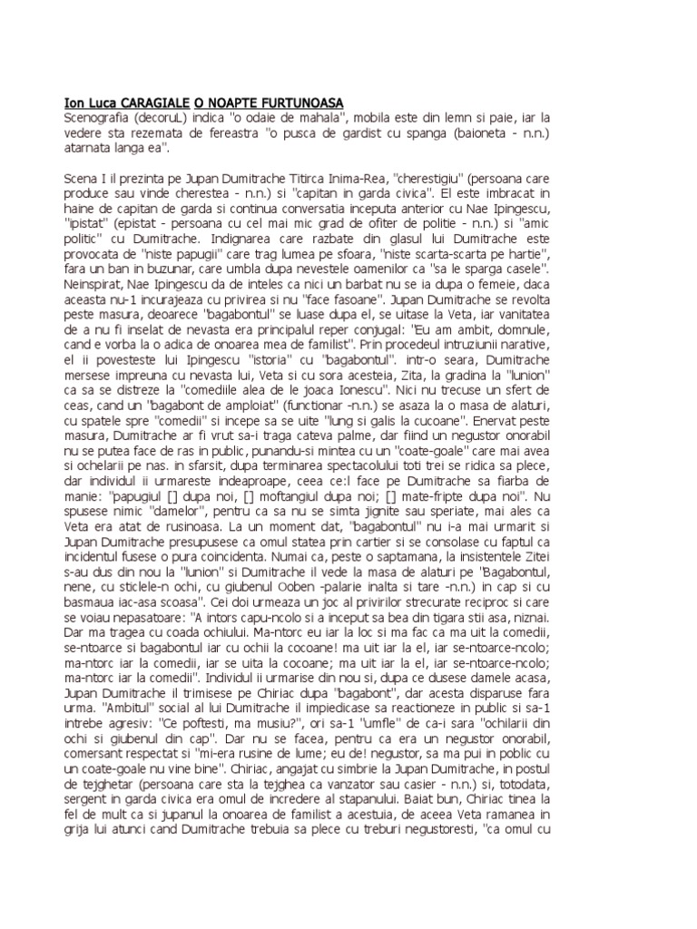 O noapte furtunoasă de ion luca caragiale rezumat o noapte furtunosa comedie in doua acte rica venturiano si zita friday 30 october 2020 turda ioan ratiu 54 3 tel. Avand ca fundal o intriga de mahala provocata de confuzie rica venturiano cauta pe zita in casa lui jupan dumitrache caragiale aduce sub luminile rampei mizeriile si ridicolul unei lumi ce se vrea burgheza. O noapte furtunoasa rezumat scurt mai jos o sa aveti mai multe rezultate pentru cautarea o noapte furtunoasa rezumat scurt. Referate o noapte furtunoasa de ion luca caragiale rezumat.