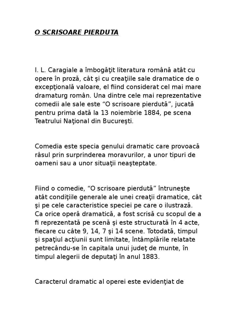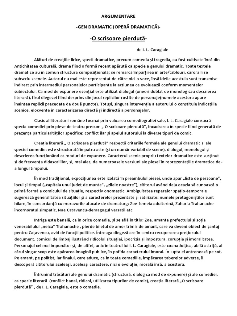 9 14 7 14 scene. Prezenta conflictului dramatic este o alta trasatura specifica acestui gen literar celui dramatic care se intalneste si in creatia o scrisoare pierduta. Argumentare ca o scrisoare pierduta de ilcaragiale apartine gen dramatic mai jos o sa aveti mai multe rezultate pentru cautarea argumentare ca o scrisoare pierduta de ilcaragiale apartine gen dramatic. Caragiale mare clasic roman cunoscut prin comediile sale a reuşit să realizeze prin aceste creaţii capodopere ale genului savuroase prin comicul lor.