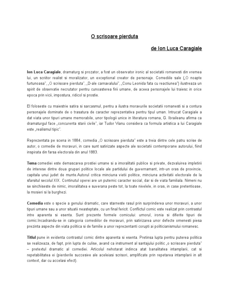 O scrisoare pierduta de ion luca caragiale eseu literatura română din a doua jumătate a secolului al xix lea se detașează prin promovarea unei literaturi autentice care să înlocuiască formele fără fond context în care se remarc. Prima dintre acestea ar putea fi veridicitatea si tipicitatea imprejurarii evocate.
