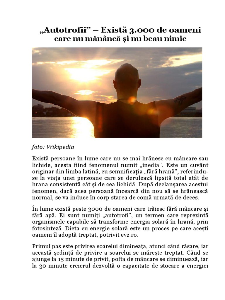 Anunt in toata lumea sunt peste 3000 de oameni autotrofi care nu mananca si nu beau apa deloc secretul constand in ideea ca organismele pot fi capabile sa transforme energia solara in hrana prin fotosinteza. Cercetătorii vor să afle de ce unii oameni nu se îngrașă deși au un stil de viață nesănătos care în cazul majorității duce inevitabil la creșterea în greutate notează independent. Oamenii nu au fost dintotdeauna stăpânii planetei. De fapt de mii de ani diferite culturi din întreaga lume au.