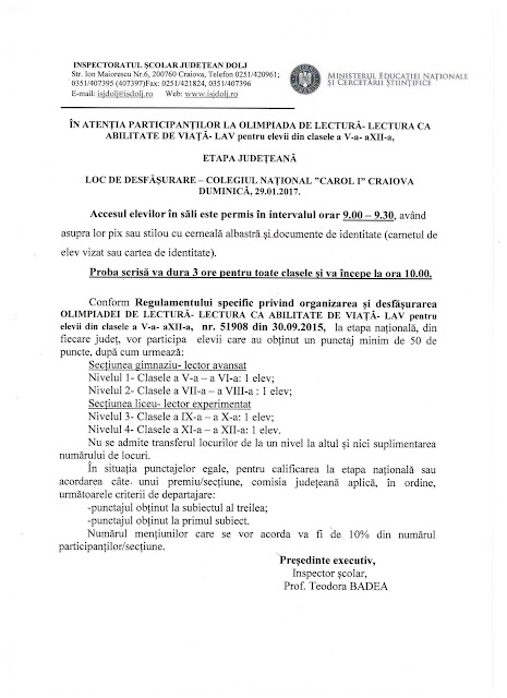 Proba scrisă ziua 1 subiecte. Clasa a v a clasa a vi a clasa a vii a clasa a viii a descarcă. Rezultate olimpiada lectura ca abilitate de viață etapa județeană 2018. Barem olav 2017 etapa nationala n2.