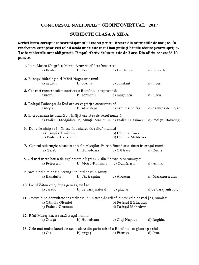 2 martie 2017 15 22. Descarcati subiectele de la concursul şcolar de. Variantele de subiecte afișate cuprind tipuri de itemi ca exemplu și reprezintă un suport de lucru de pregătire pentru concurs. Subiecte si bareme de la olimpiada de geografie editia 2016.