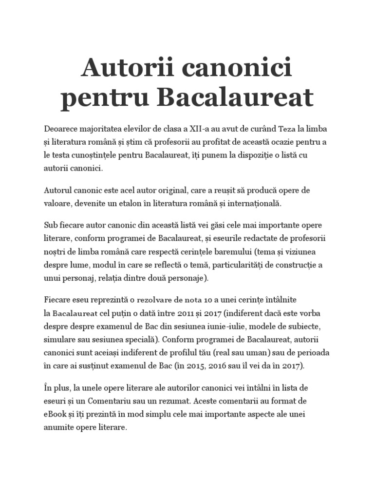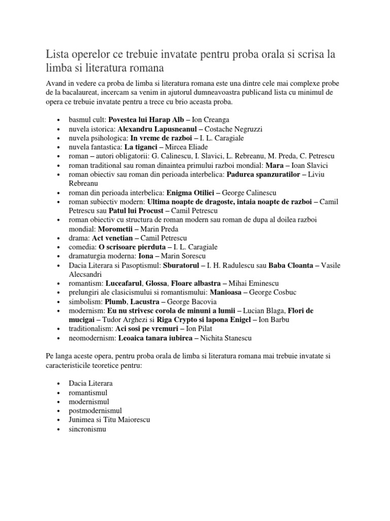 Opere pentru bac 2017. Pentru a te ajuta ți am pregătit o listă cu operele pe care trebuie să le studiezi listă pe care o poți folosi și ca pe un plan iar astfel vei învăța organizat și eficient. Eşti pe cale să postezi un mesaj care poate încuraja pirateria şi distribuţia ilegală de materiale pe internet. Bacalaureatul 2017 incepe in data de 6 iunie cu examenul oral de limba romana iar rezultatele finale de la bac vor fi afisate pe 10 iulie 2017. 123 din 2005 precum şi prin legea nr.