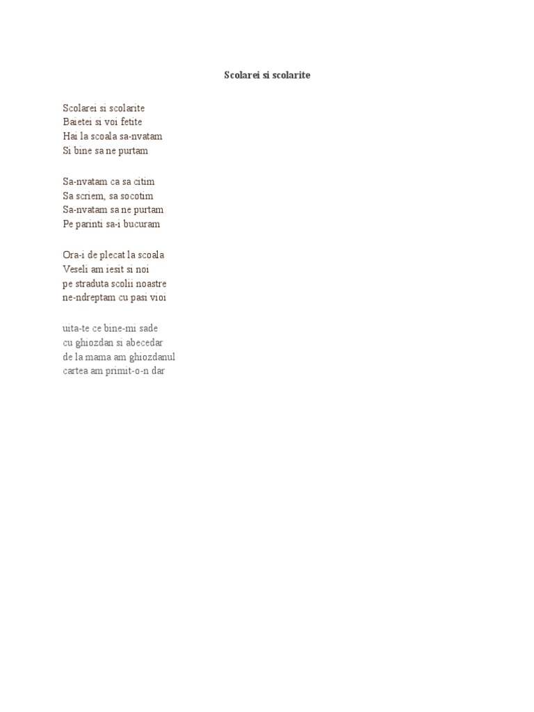 Spre străduța școlii noastre ne ndreptăm cu pași vioi. Suntem mari suntem mari noi acum suntem școlari. 0 stele 0 review uri. Uită te ce bine mi șade cu ghiozdan și abecedar de la mama am ghiozdanul cartea am primit o n dar.