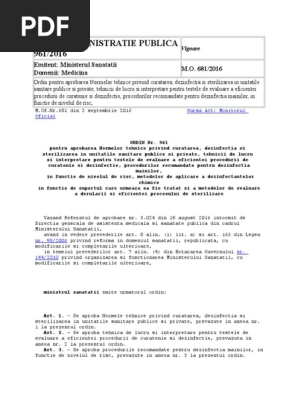 Ordin 961 din 19 august 2016. 681 din 2 septembrie 2016 notă ctce. 961 2016 din 19 august 2016 pentru aprobarea normelor tehnice privind curăţarea dezinfecţia şi sterilizarea în unităţile sanitare publice şi private tehnicii de lucru şi interpretare pentru testele de evaluare a eficienţei procedurii de curăţenie şi dezinfecţie procedurilor. Ministrul sănătăţii vlad vasile voiculescu bucureşti 19 august 2016. Forma consolidată a normelor tehnice din 19 august 2016 publicate în monitorul oficial nr.