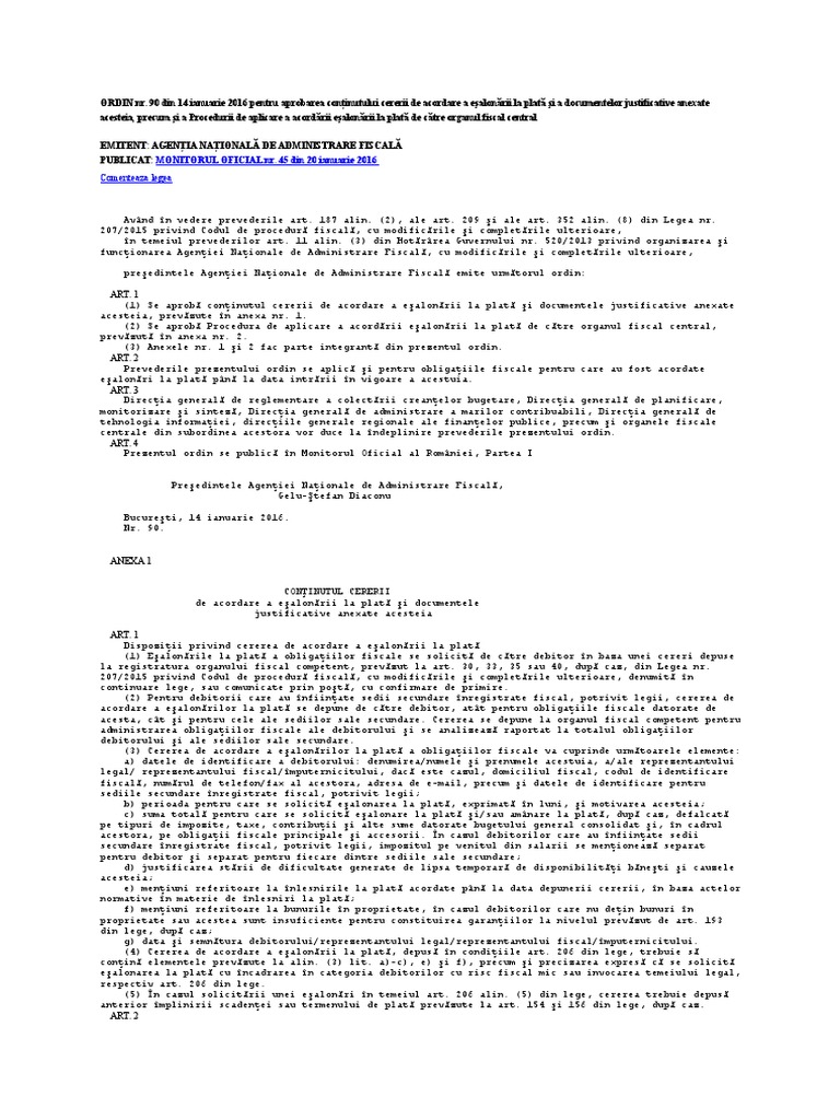 90 2016 pentru aprobarea conţinutului cererii de acordare a eşalonării la plată şi a documentelor justificative anexate acesteia precum şi a procedurii de aplicare a acordării eşalonării la plată de către organul fiscal central publicat în monitorul oficial nr.
