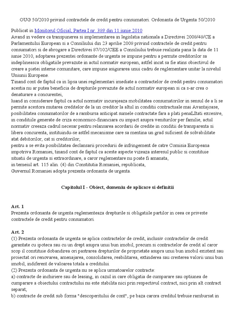 Ordonanta 50 2010. 288 2010 pentru aprobarea ordonanţei de urgenţă a guvernului nr. Oug 50 stabilește și componența dobânzii variabile. Această dobândă era formată înainte de această ordonanță din euribor robor libor și o marjă a băncii la unele bănci și din indicele băncii ales după bunul plac plus marja fixă a băncii. 389 din 11 iunie 2010 avand in vedere ca transpunerea si implementarea in legislatia nationala a directivei 2008 48 ce a parlamentului european si a consiliului din 23 aprilie 2008 privind contractele de credit pentru consumatori si de abrogare a directivei 87.