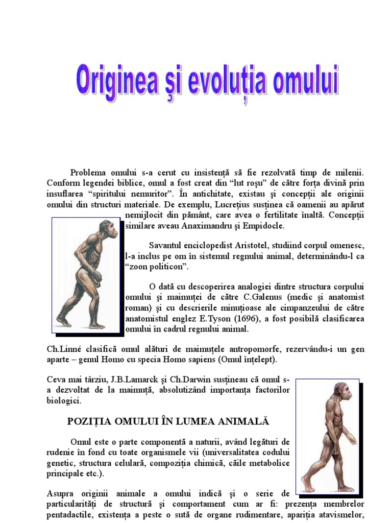 Factorii ce au influenţat apariţia omului2. Originea si evolutia omului 0 in urma cercetarilor la nivel molecular observatiile sugereaza ca primii stramosi ai omului sau desprins din cei ai cimpanzeilor in urma cu aproximativ cinci milioane de ani. Acum 70 de miloane de ani a aparut ordinul primatelor care s a desprins din mamiferele arboricole si care s au diversificat in mai multe linii evolutive din care s au desprins hominoizii. Originea și evoluția omului de horia pe 9 iulie 2019 dinozaurii mai stăpâneau pământul atunci când a apărut veverița arborescentă acesta fiind primul animal asemănător primatelor.