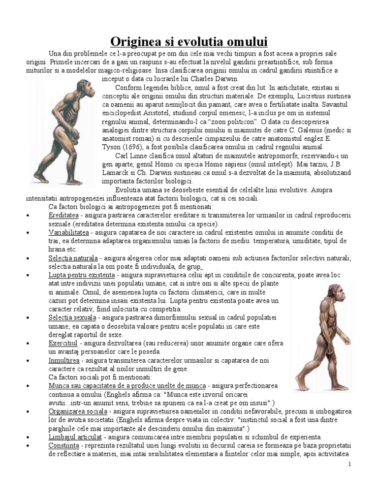 Originea si evolutia omului una din problemele ce l a preocupat pe om din cele mai vechi timpuri a fost aceea a propriei sale origini.
