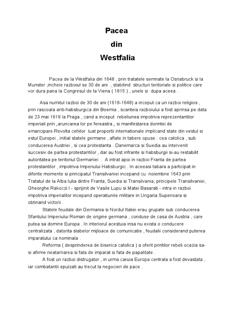 Pacea de la westfalia. învăţământ liceal istorie diverse clasa a 9 a. The peace of westphalia german. Pacea din westfalia un punct de cotitură în istoria europei reunirea atât de multor şefi de state europene cum este cea la care asistăm astăzi constituie cu siguranţă un eveniment de excepţie a spus în octombrie 1998 roman herzog fost preşedinte al republicii federale germania. Acest set de principii şi a găsit prima formulare oficială în 1648 prin tratatul de pace de la westfalia.