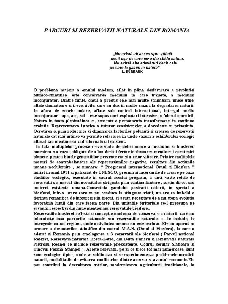 Parcuri si rezervatii naturale din romania referat. Profesor indrumator prezentat profesorului. Parcurile nationale si rezervatiile se bazeaza pe biodiversitate tocmai. Astfel pe teritoriul țării noastre întâlnim 13 parcuri naționale 13 parcuri naturale rezervația biosferei delta dunării și câteva sute de rezervații și monumente ale naturii. Arhiva contine 1 fisier doc de 12 pagini.