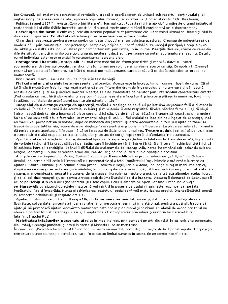 Textul lui creanga poneste de la schema basmului popular dar se distanteaz de acesta prin. In acest sens tema basmului lui ion creanga devine mai mult decat confruntarea conventionala dintre bine si rau din basmul popular procesul de maturizare a unui erou care. Povestea lui harap alb de ion creanga. Varianta 04 particularitatile de constructie a unui personaj dintr un basm cult.