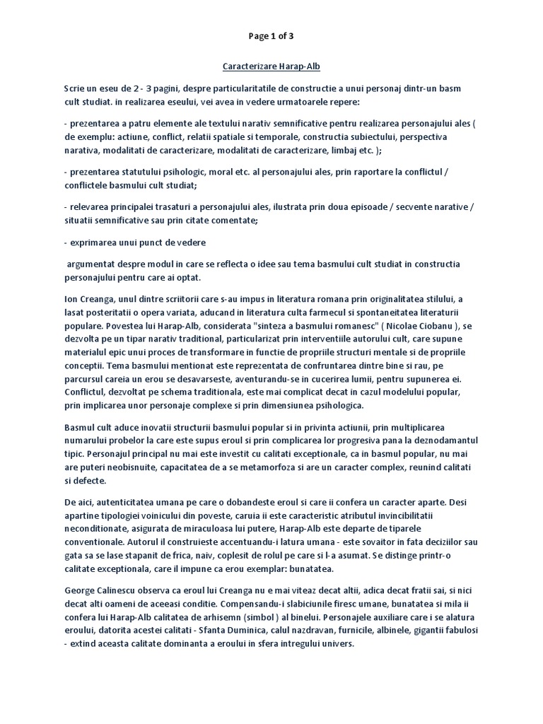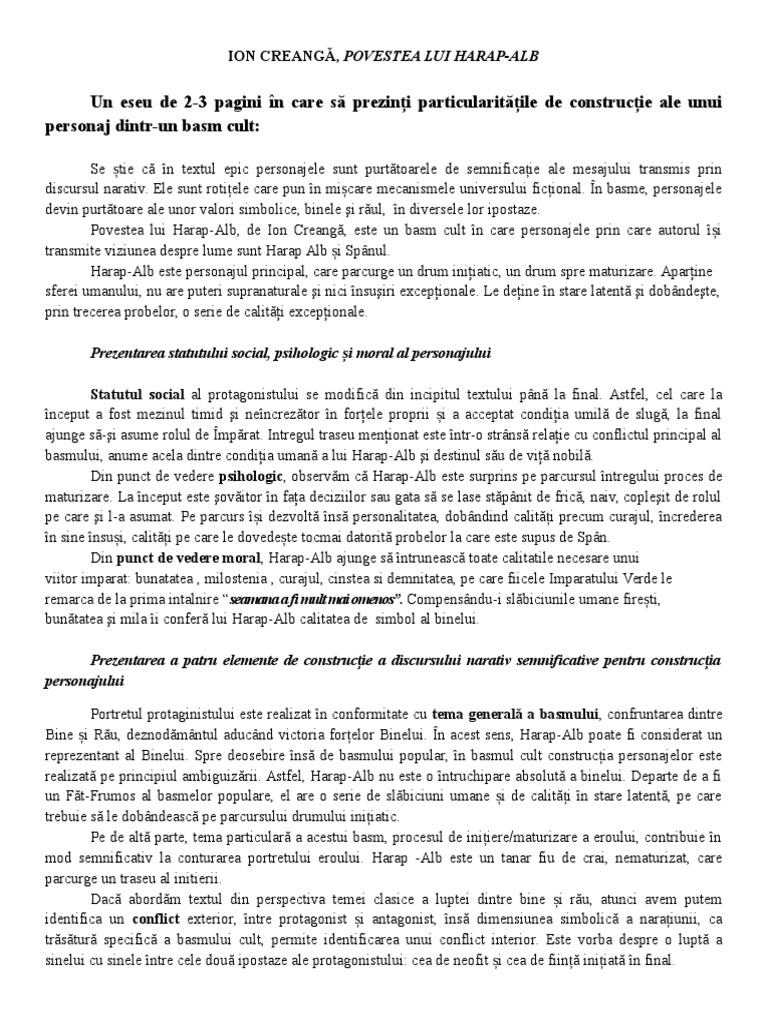 Particularitățile de construcție a unui personaj dintr un text narativ unde am ales. Acest comentariu se poate utiliza și pentru construcția unui personaj. Aceast oper se ncadreaz n specia literar basm basm cult cu teme specifice precum lupta dintre dou fore opozante binele i rul lupt ce se ncheie cu triumful binelui. Harap alb particulariti de construcie ale personajului.