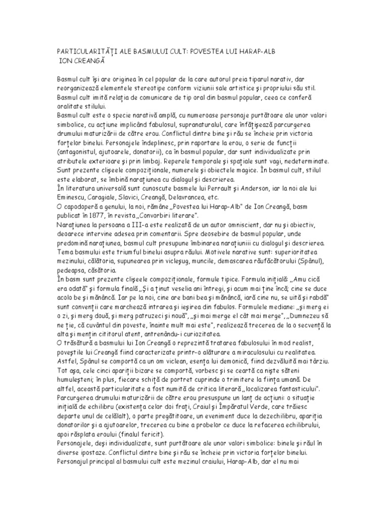 Povestea lui harap alb de ion creanga opera publicata in 1877 apartine prin trasaturile sale definitorii speciei literare basmul cult. Dimensiunea simbolica a naratiunii umanizarea fantasticului oralitatea stilului si umorul ca marci ale oralitatii scriitorului humulestean. Cele trei nume ale lui corespund in plan compozitional celor trei etape ale drumului. Povestea lui harap alb.
