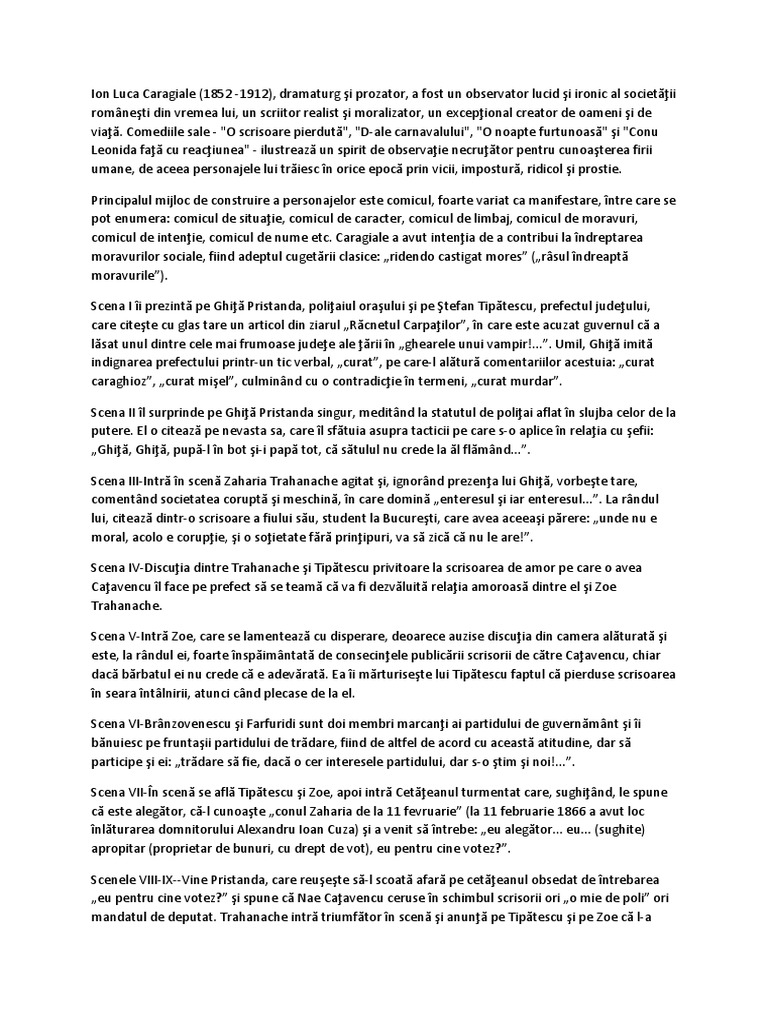 Cațavencu ilustrează de altfel tipul uman al demagogului ambițios lipsit de scrupule care vrea cu orice preț să obțină un statut social și politic mai bun având o ușurință deosebită în a vorbi mult fără a spune nimic într un limbaj care evidențiază o cultură. în plus vei putea folosi acest eseu pentru a răspunde la cerința de a scrie un material în care să prezinți particularitățile de construcție a unui personaj dintr un text. Desfășoară în capitala unui județ de munte pe fundalul unei agitate campanii electorale. Stefan tipatescu este unul din personajele principale ale comediei de moravuri politice o scrisoare pierduta de i l caragiale comedie ce ilustreaza dorinta de parvenire a burgheziei in timpul alegerilor de deputati din 1883.