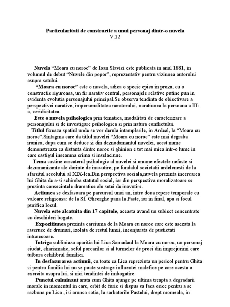 Particularitati de constructie ale personajului. Nuvela reconstituie artistic cea de a doua domnie a lui alexandru lăpuşneanul 1564 1569 lupta pentru impunerea autorităţii domneşti şi consecinţele deţinerii puterii de un domnitor crud pe fundalul realităţilor social politice ale secolului al xvi lea în moldova. Particularitățile de construcție a unui personaj din nuvela moara cu noroc. Răspunse lăpuşneanu a căruia ochi scânteiară ca un fulger fiind un bun cunoscător al firii umane lăpuşneanu îl cruţă pe moţoc pentru încercarea de a l înşela din nou deoarece avea nevoie de acesta ca să mai uşureze blăstemurile norodului. Observaţiile asupra fizionomiei personajului făcute de negruzzi reflectă trăirile interioare ale eroului.