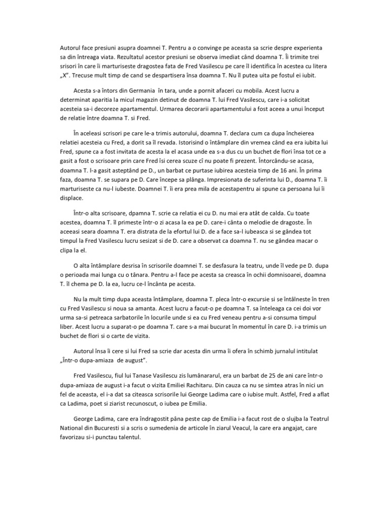 Acest rezumat este pe capitole cartea avand 3 capitole in care sunt prezentate cateva scrisori si epilog i si epilog ii in care sunt prezentate alte actiuni. Autorul face presiuni asupra doamnei t. Pentru a o convinge pe aceasta să scrie despre experienţa sa din întreaga viaţă. Aparitia celui de al doilea roman 1933 al lui camil petrescu la scurta vreme de primul succes obtinut prin ultima noapte de dragoste intaia noapte de razboi a insemnat un eveniment cu totul deosebit novator in fundamentarea romanului romanesc modern.