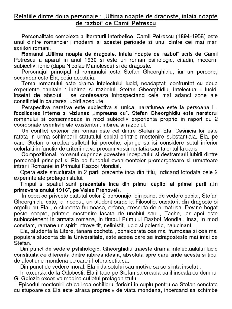 Ultima noapte de dragoste întâia noapte de război este un roman al experienţei atât la nivel formal prin structură şi tehnici narative cât şi la nivelul conţinutului. Referat despre caracterizare personaje ultima noapte de dragoste intaia noopte de razboi de camil petrescu. Ultima noapte de dragoste întâia noapte de război este romanul unui spirit care încearcă să se definească prin raportare la două experienţe capitale. Personajul narator care ofera o perspectiva subiectiva asupra intamplarilor.