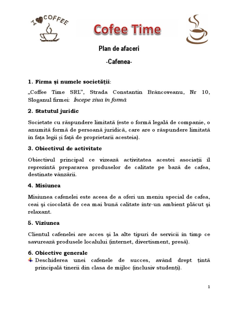 Plan de afacere cafenea. Sinteza planului de afaceri descrierea succinta a firmei cafeneaua lifestyle caffe se va deschide pe data de 11 mai 2012 in calitate de sre limitata formata din 3 asociati totalul sumei aduse de acestia fiind de 60000 de euro si va face parte din categoria intreprinderilor mici. în toate situațiile pentru a începe o afacere indiferent de domeniul ales va trebui să înregistrezi o societate comercială să obții avizele și autorizațiile necesare și să îți faci un plan de afaceri cu. El contine atat prezentarea afacerii cat si graficele si cash flow aferent activitatii. Academia edu is a platform for academics to share research papers.