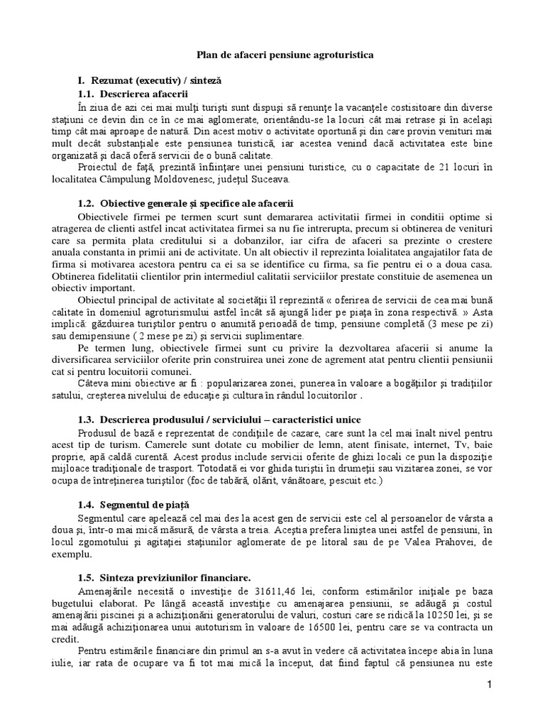 Arhiva contine 2 fisiere doc de 9 pagini in total. Mai jos poate fi vizualizat un extras din document aprox. Model plan de afaceri pensiune agroturistica.