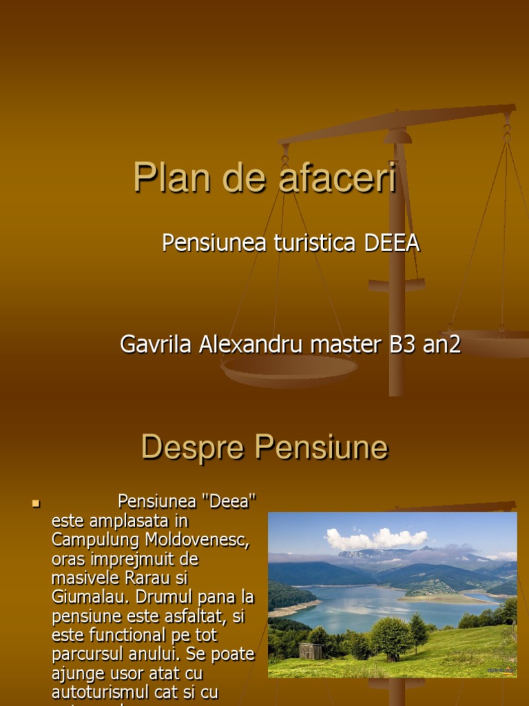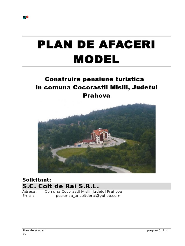 13 13 consideraram este documento inútil. 6 27 capitolul ii înfiinţarea unei pensiuni turistice vă permite să oferiţi clienţilor serviciile pe care doar le. Acest plan de afaceri îşi propune ca obiectiv general dezvoltarea activităţilor turistice rurale în scopul creşterii numărului locurilor de muncă a veniturilor şi atractivității zonelor rurale. Plan de afaceri pensiune turistică şi.