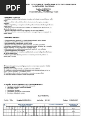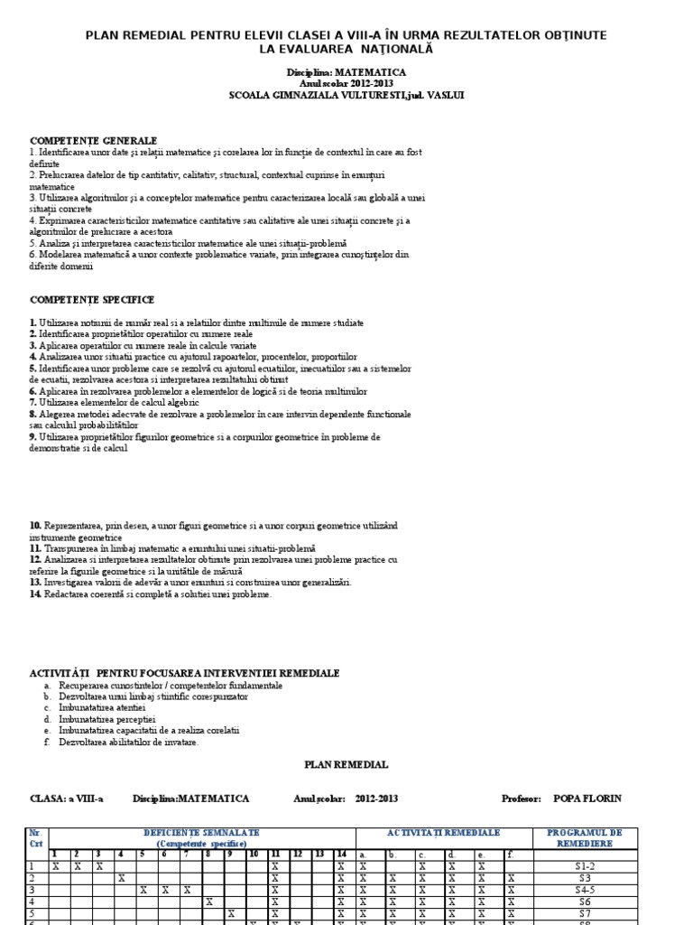 Plan remedial matematica gimnaziu. Cand doua unghiuri sunt complementare cand doua unghiuri sutn suplementare cand un numar divide alt numar care sunt divizorii unui numar care sunt multipli unui numar compararea puterilor congruenta triunghiurilor cum aflam valoarea raportului dintre doua numere cum aplicam proprietatea fundamentala a proportiilor cum aplicam teorema lui pitagora cum aratam ca doua triunghiuri sunt congruente. Desfăşurarea orelor de pregătire suplimentară după o tematică bine stabilită. Matematica anul scolar 2012 2013 scoala gimnaziala vulturesti jud. Salvare salvați plan remedial gimnaziu pentru mai târziu.